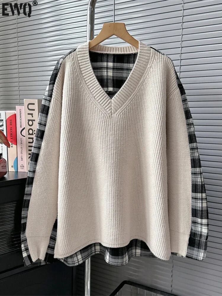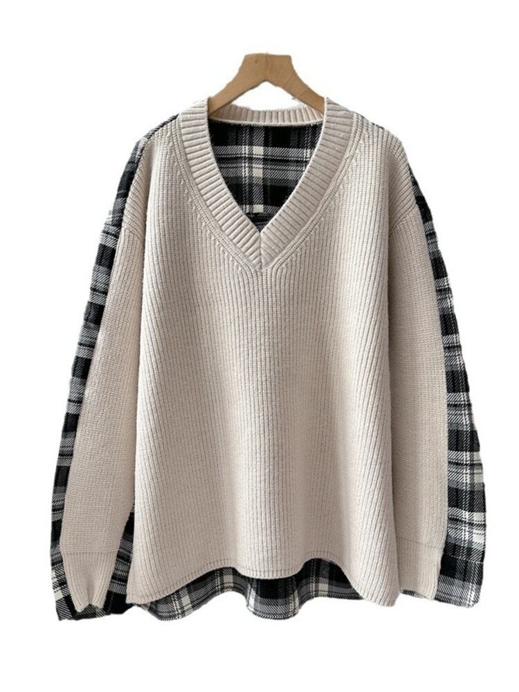 [EWQ] パッチワーク チェック柄 Vネック セーター Womem Vネック 長袖 ゆったり プルオーバー ニット トップス 秋冬 16U5089 ロング オータム 秋物 ウィンター 冬物