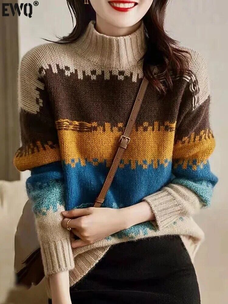 [EWQ] ハーフタートルネックコントラストカラーレインボーストライプニットカシミヤプルオーバーボトムセーター暖かい秋冬 U6477 オータム 秋物 ウィンター 冬物