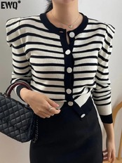 [EWQ] ストライプコントラストカーディガンコート長袖シングルブレストセータージャケット秋潮生き抜く ロング オータム 秋物