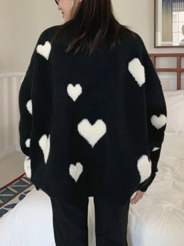 [EWQ] ブラック ホワイト プルオーバー セーター Oネック ラブハート柄 ジャガード コントラストカラー 厚手 長袖 秋冬 6U6343 ロング オータム 秋物 ウィンター 冬物