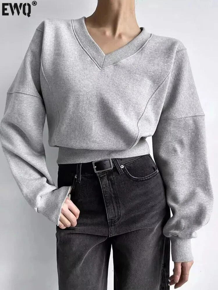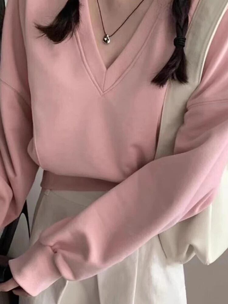 [EWQ] 秋冬 シンプル V ネック ゆったり 万能 無地 長袖 プルオーバー ショート トレーナー レディース 6U6575 ロング オータム 秋物 ウィンター 冬物 Vネック ソリッドカラー