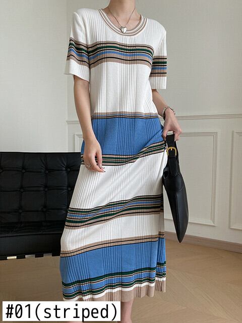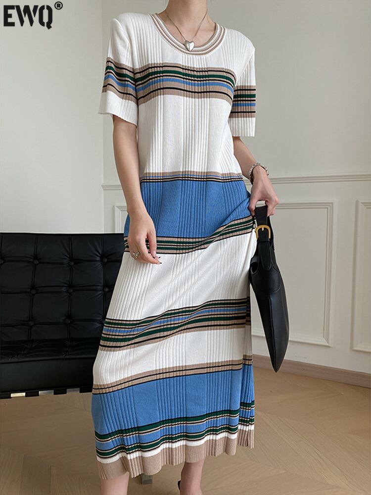 [EWQ] ストライプコントラストニットドレス半袖ルーズ気質ニットドレス夏潮 Vestido ショート ハーフスリーブ サマー 夏物