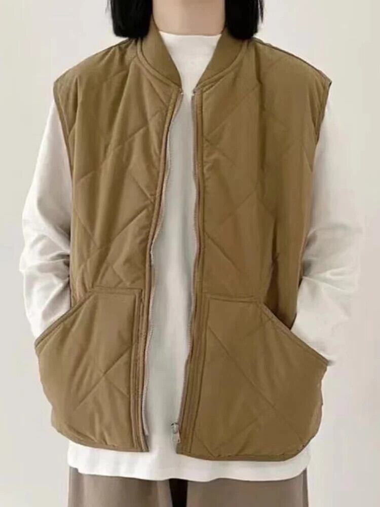 [EWQ] シックシンプルチェック柄スタンドネックノースリーブコットンコートルーズカーキタンクトップス秋 16U5450 オータム 秋物 ソリッドカラー