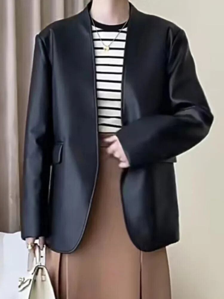 [EWQ] ストリート ブラック シンプル バイク レザー ショートコート ボンバー レディース カーディガン ジャケット レディース 秋冬 16U6556 オータム 秋物 ウィンター 冬物