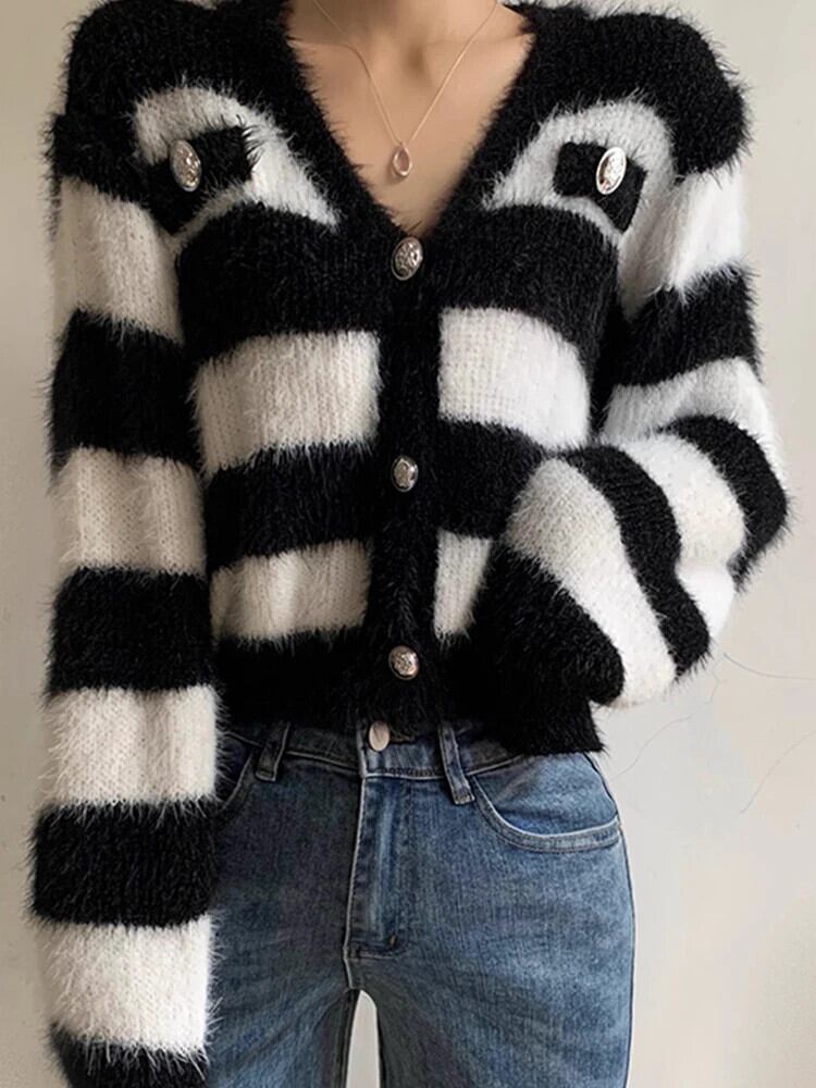 [EWQ] 秋冬 V ネックシングルブレストストライプコントラストカラー多用途長袖ニットカーディガンセーター U6513 ロング オータム 秋物 ウィンター 冬物 Vネック