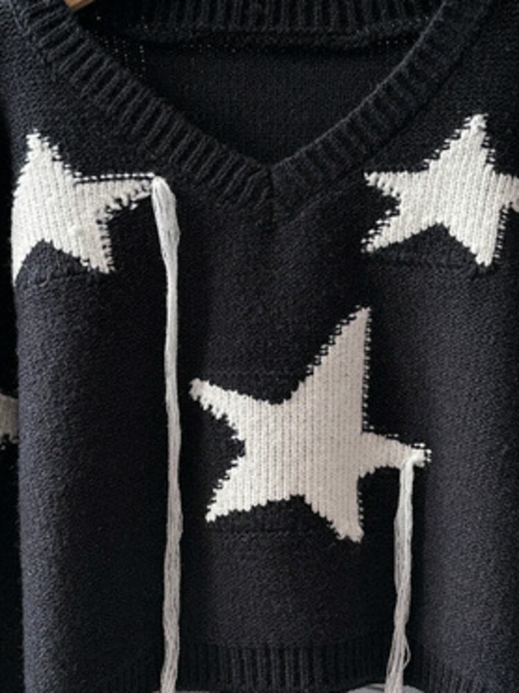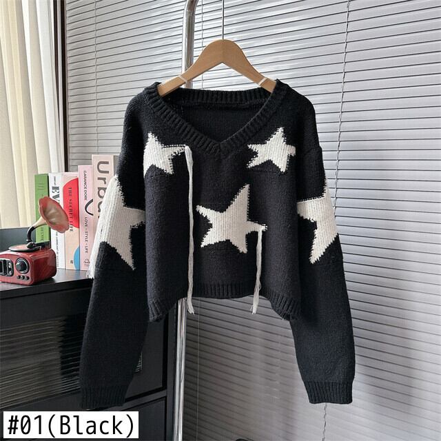 [EWQ] ブラック クリームホワイト V ネック プルオーバー ニット テルスター柄 暖かい セーター 婦人 秋冬 16U5891 オータム 秋物 ウィンター 冬物 Vネック