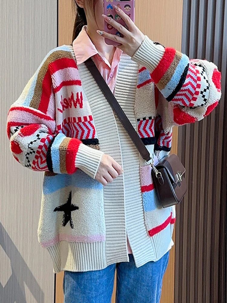 [EWQ] オーバーサイズ V ネック コントラストカラー ストライプ カーディガン セーター オールマッチ レディース ニット 秋冬 6U6474 オータム 秋物 ウィンター 冬物 Vネック