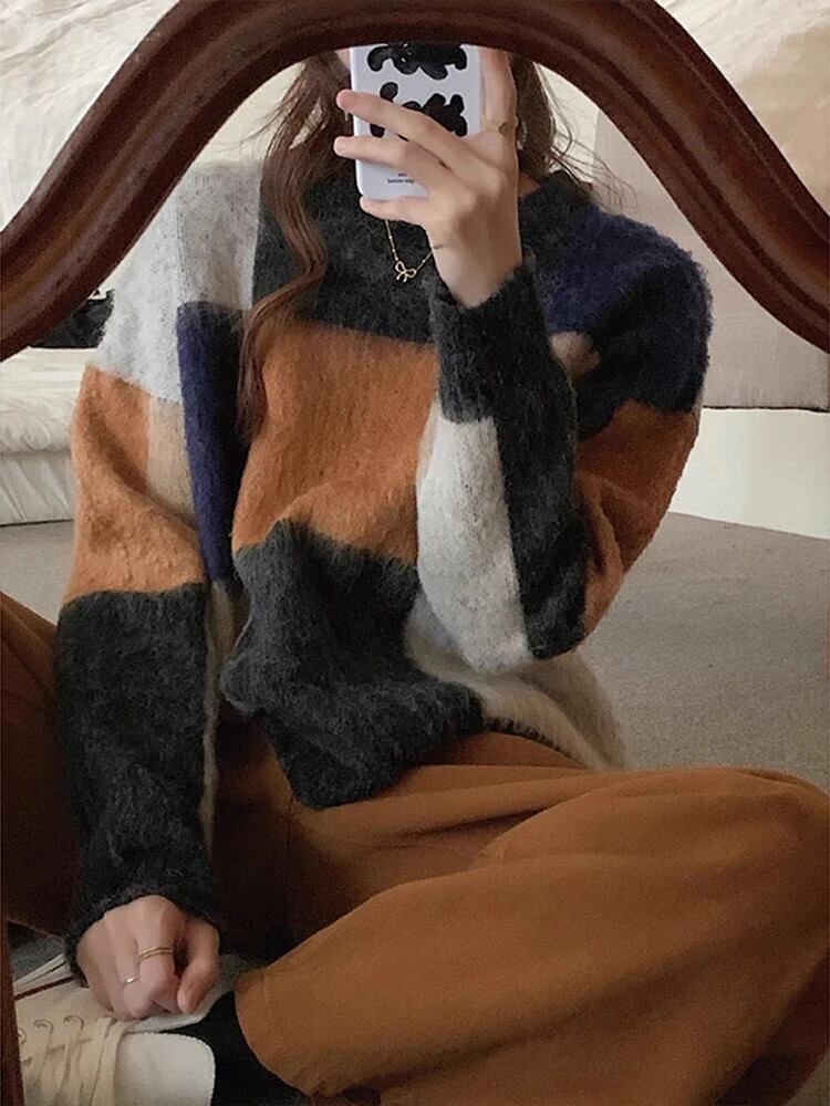 [EWQ] O ネックコントラストカラーチェック柄フリースプルオーバーニットセータールーズトップ秋冬 16U6267 オータム 秋物 ウィンター 冬物 Oネック