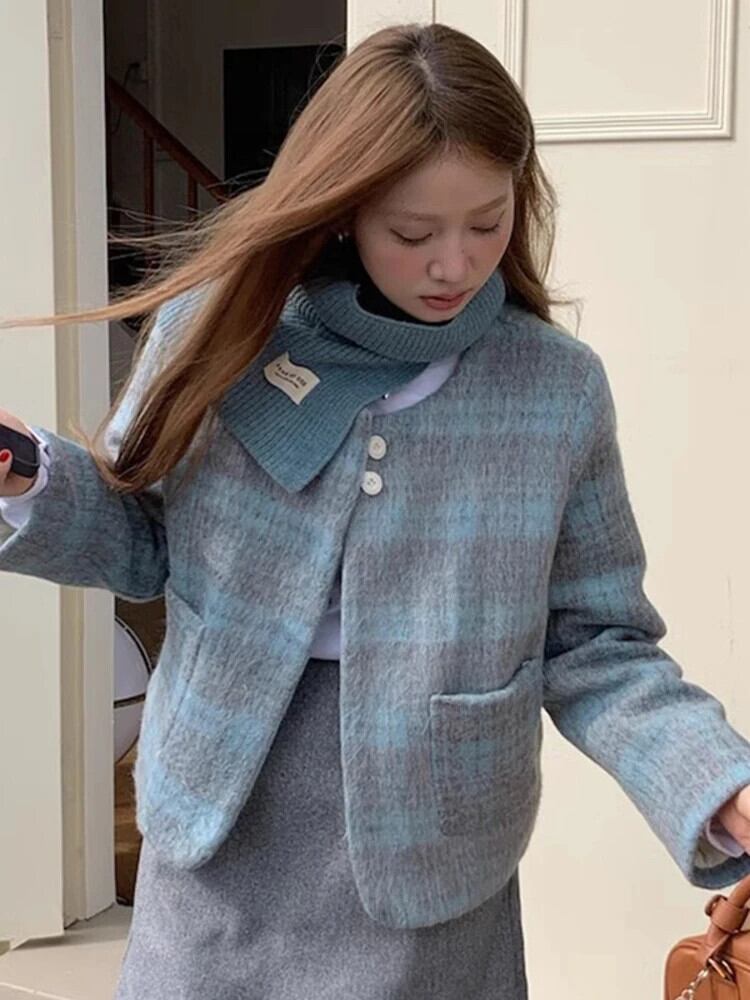 [EWQ] Oネックボタンチェック柄コントラストカラーレディース厚手防寒着ウールコートジャケットアウター秋冬16U6601 オータム 秋物 ウィンター 冬物