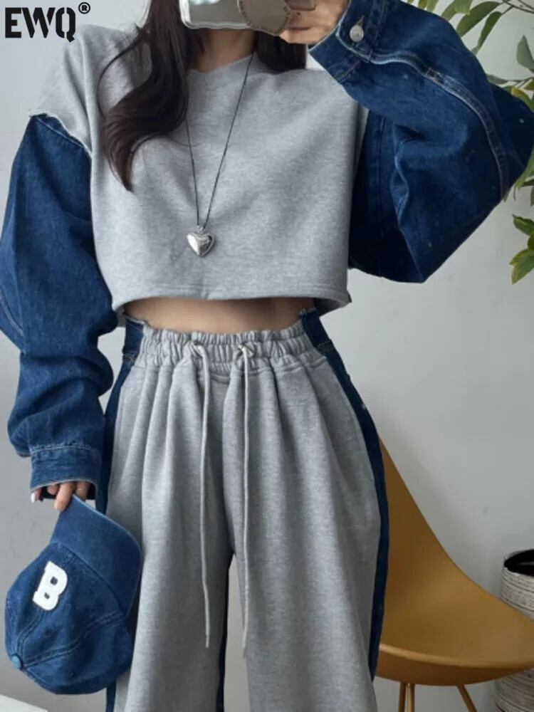 [EWQ] 長袖デニムパッチワークスウェットルーズストリート O ネックプルオーバートップ秋冬 16U5217 ロング シャツ オータム 秋物 ウィンター 冬物 Oネック