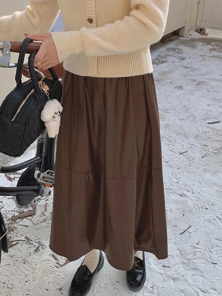 [EWQ] ブラックコーヒーウエストスリム PU レザースカートオールマッチボトム秋冬 U6866 オータム 秋物 ウィンター 冬物