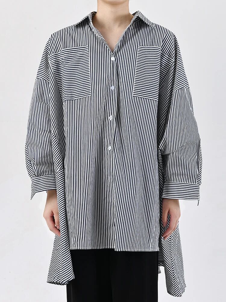 [EWQ] 不規則スプライスストライプシャツシックバットウィング長袖ビッグサイズブラウス美しい冬 P1963 ロング ウィンター 冬物