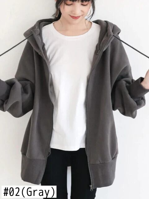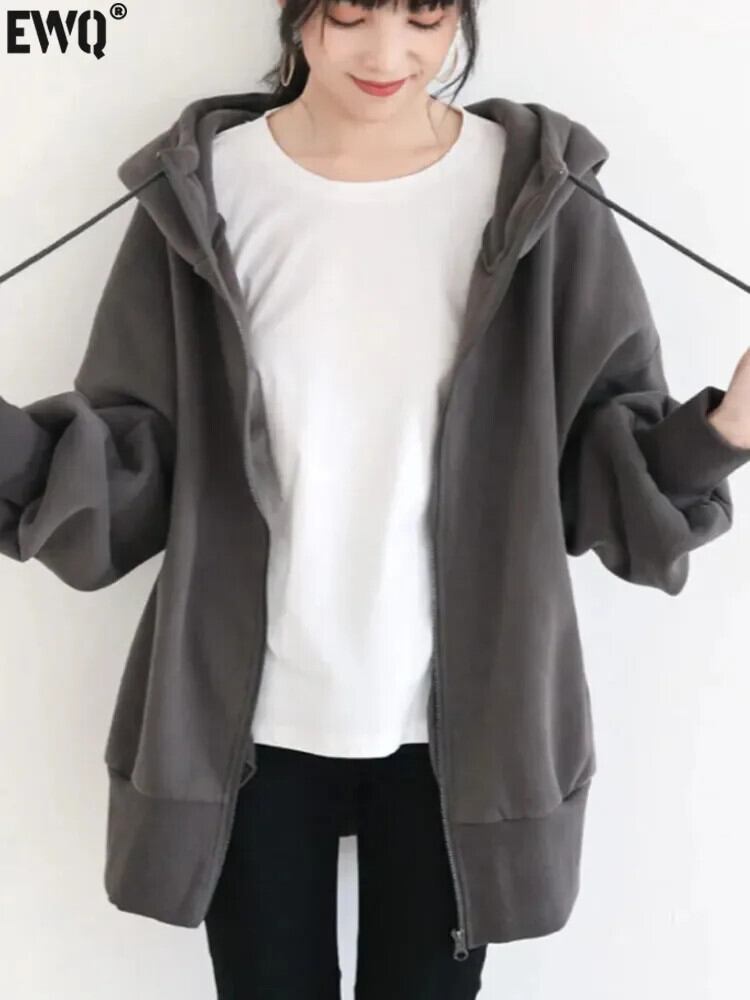 [EWQ] ルーズコート ストリート スウェットシャツ ジッパー 巾着 フード付き ベルベット レディース グレー 秋冬 16U5462 オータム 秋物 ウィンター 冬物