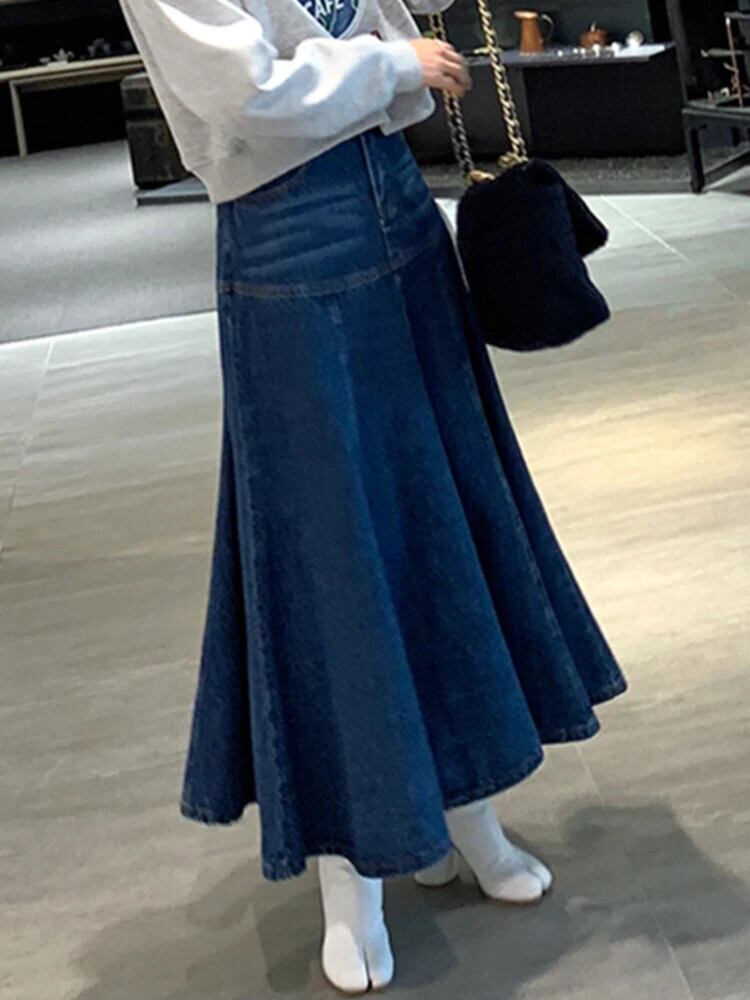 [EWQ] ストリートダークブルーウエスト A ラインフィッシュテールデニムロングスカートスプライス半身スカート 2024 春秋 16U6955 スプリング 春物 オータム 秋物 Aライン