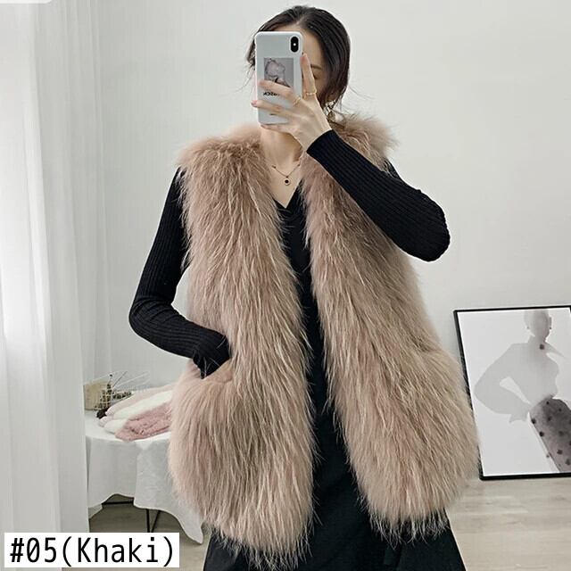[EWQ] ストリートフェイクフォックスラクーンファーノースリーブベストミディアムロングコート秋冬 U5946 オータム 秋物 ウィンター 冬物