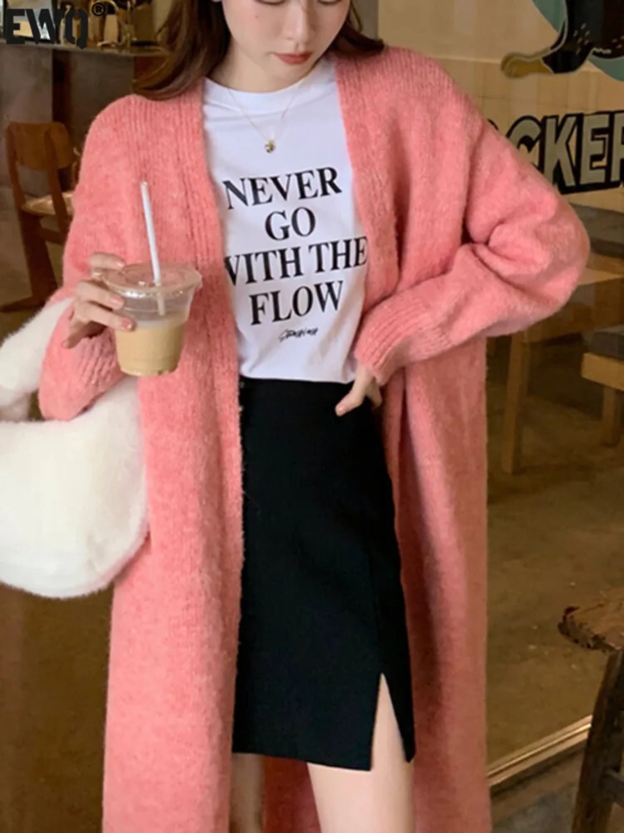 [EWQ]シックスウィートピンクニットカーディガンセーターゆったり長袖ミドルロングニットトパーズ秋16U5465 大人ガーリー キュート カジュアル オータム 秋物 黄玉