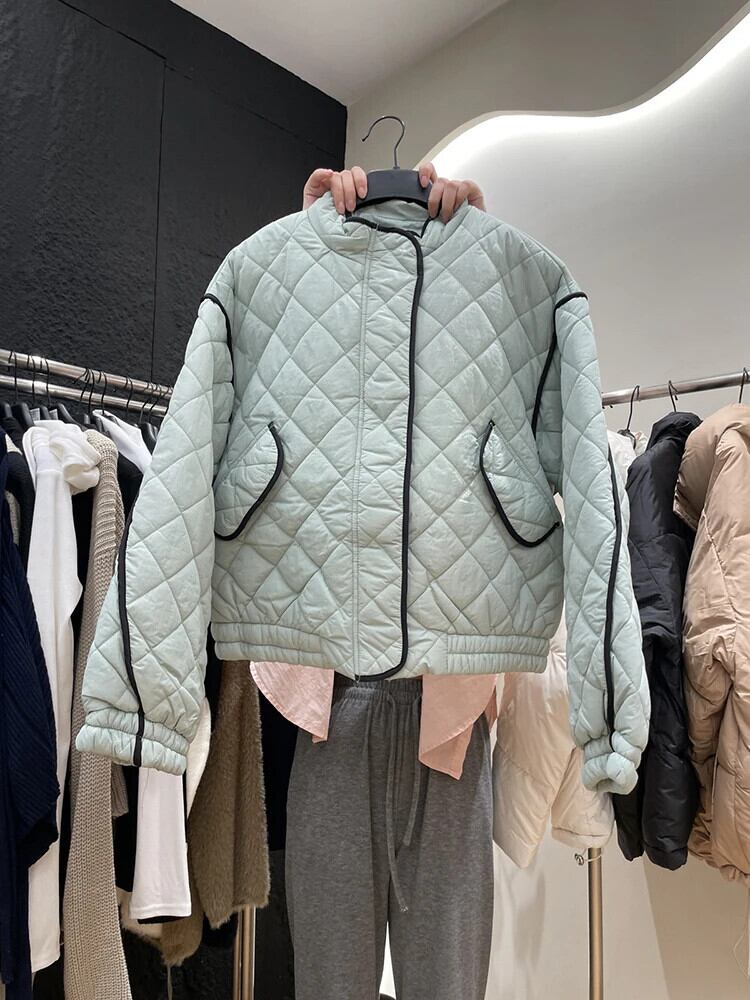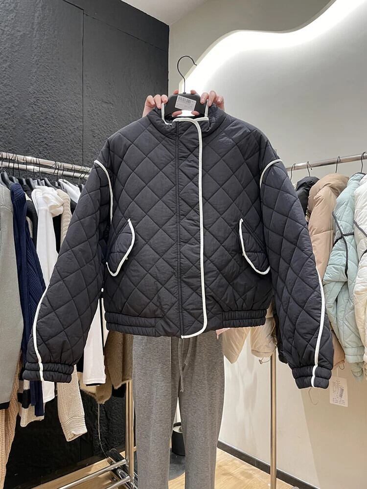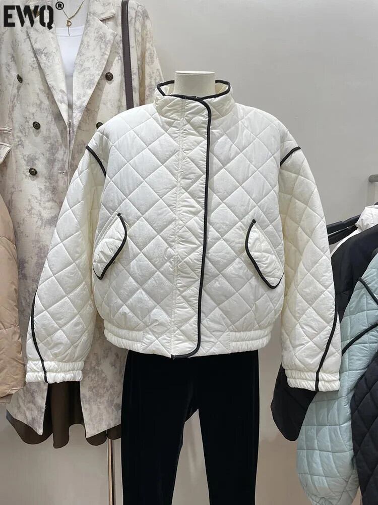 [EWQ] ストライプ チェック柄 スタンドカラー ポケット ゆったり レディース 暖かい 中綿コート アウター 秋冬 6U6171 コットン オータム 秋物 ウィンター 冬物