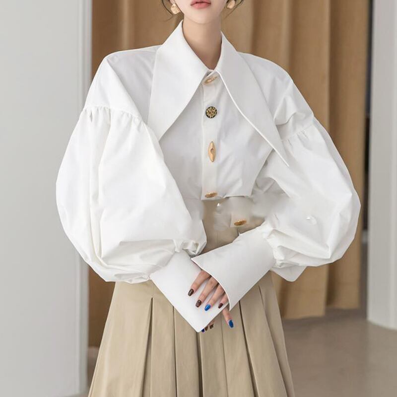 [EWQ] シックオフィスレディブラウスルーズランタン長袖白シャツボトムシャツトップス U4238 ロング ホワイト 会社 学校 通勤や通学にも
