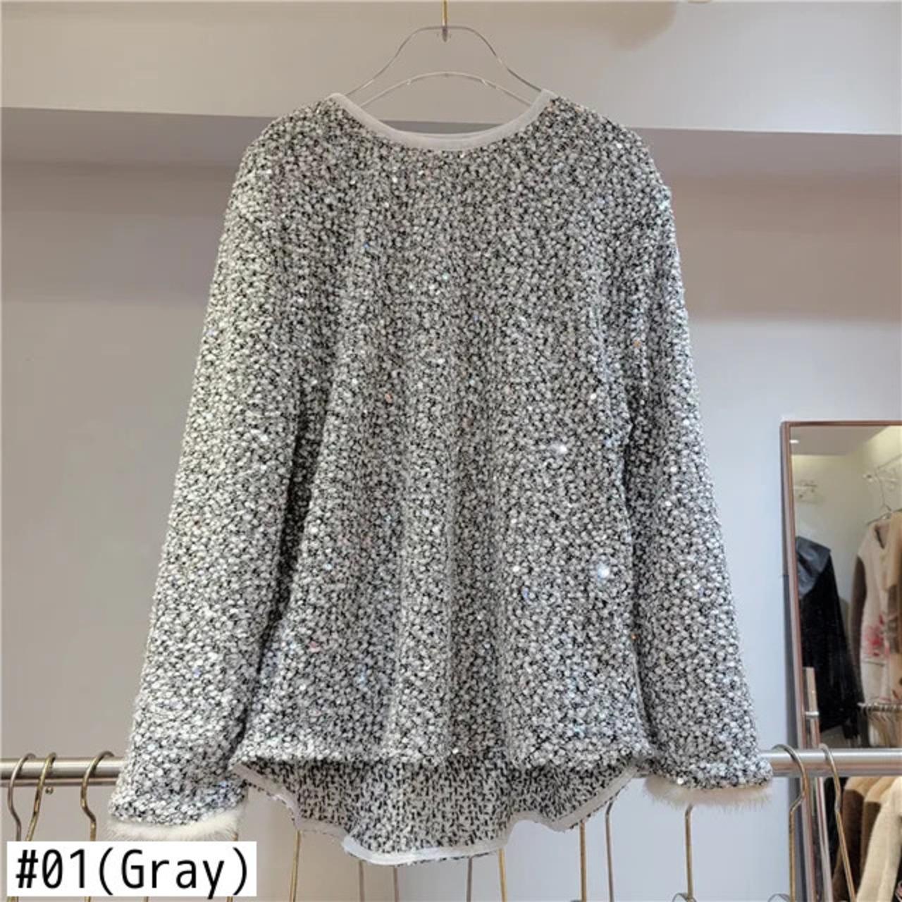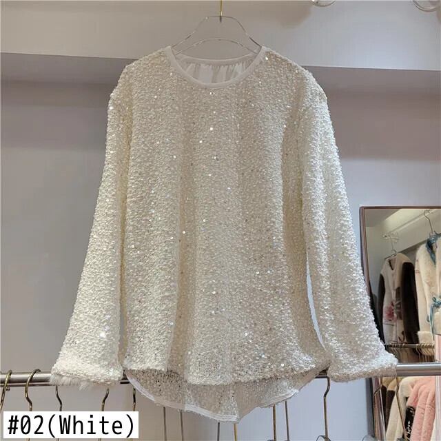 [EWQ] ミンクファーパッチワークスパンコール長袖ラウンドネックプルオーバーセーター婦人2024春夏16U6999 ロング スプリング 春物 ウィンター 冬物 Oネック