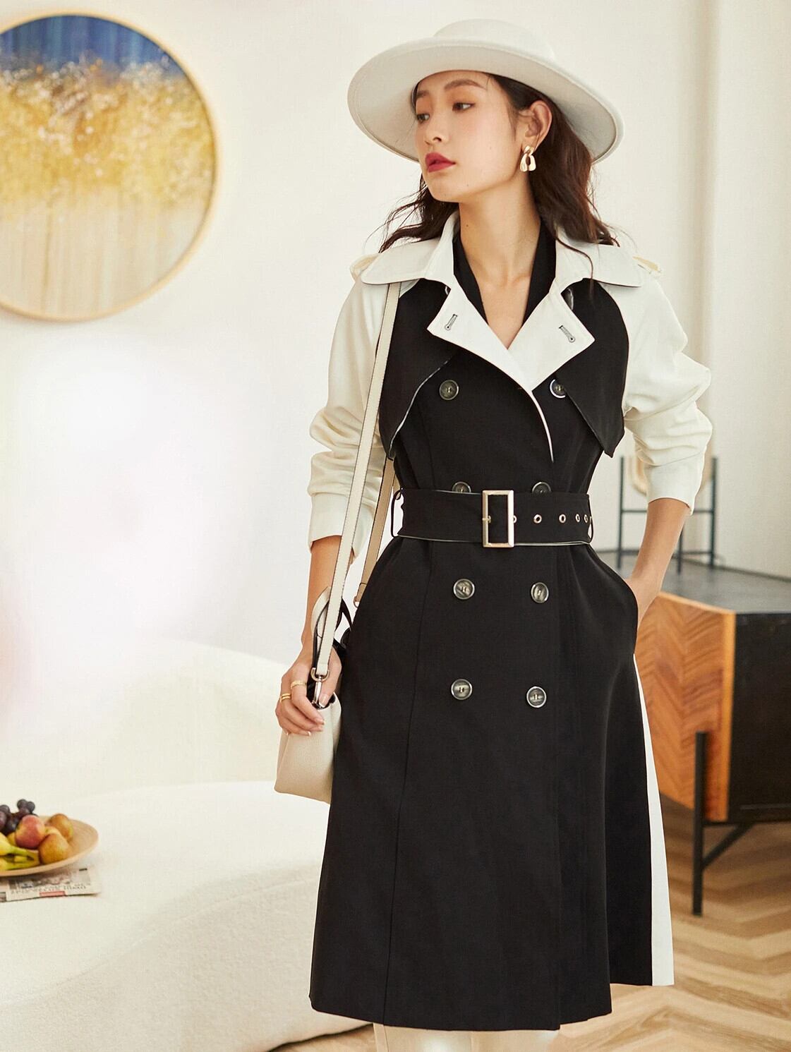 [EWQ] ブラック トレンチ コート アウター ビッグサイズ カラーブロック ベルト付き トレンチ レディース 長袖 ウインドブレーカー 潮 春 2024 秋 ロング スプリング 春物 オータム 秋物 ハーネス