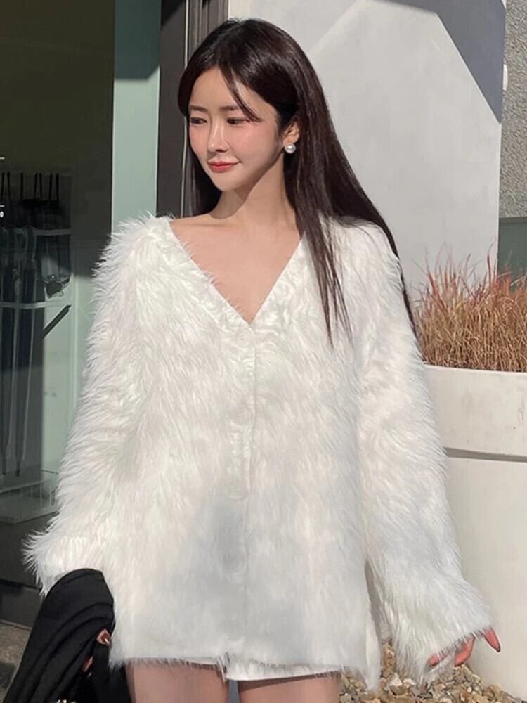 [EWQ] V ネックシングルブレストフューリールーズ多用途長袖ミンクフェイクファーセーターコート秋冬 6U6512 ロング オータム 秋物 ウィンター 冬物 Vネック