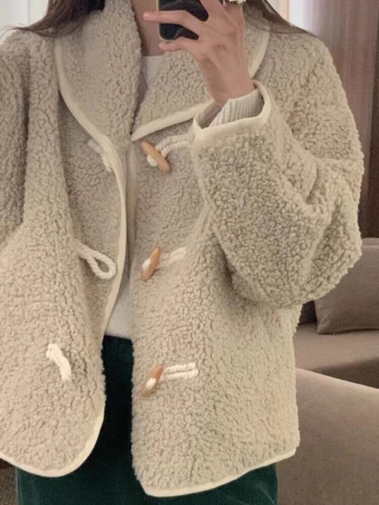 [EWQ] ホーンボタン子羊ウールコート冬長袖厚手ラペル生き抜くジャケット秋冬 16U4955 ロング オータム 秋物 ウィンター 冬物