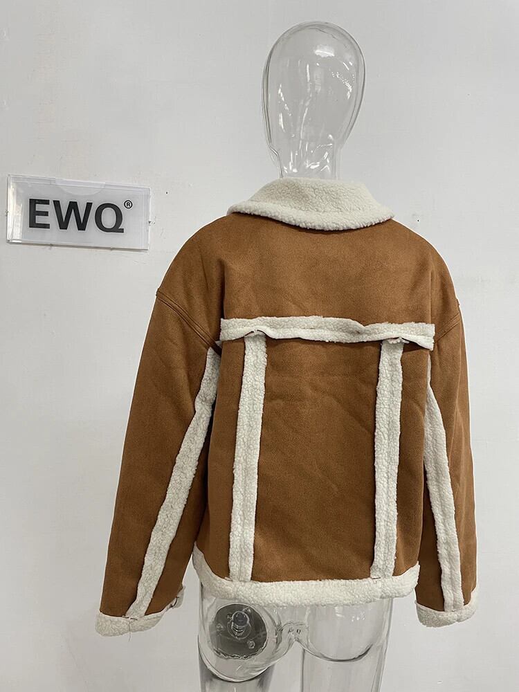 [EWQ] ホーンボタン ラペル ラムウール コート ゆったり 長袖 厚手 暖かい ショート ジャケット 秋 16U5493 ロング オータム 秋物