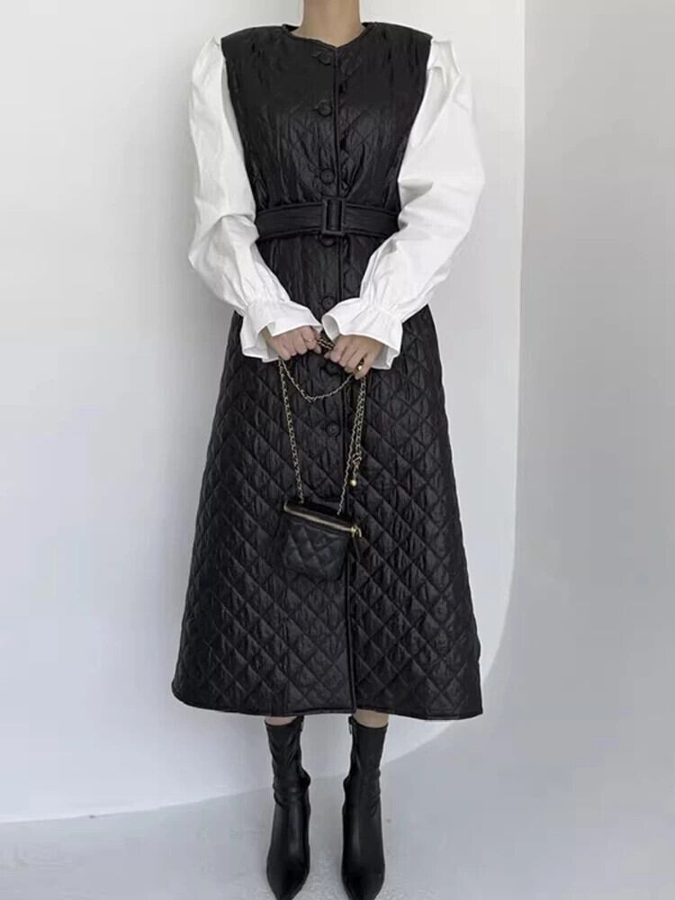 [EWQ] ラウンドネックシングルブレストパッチワークフェイクツーピースウエストバンドスリムコットンパッド入りドレス秋冬 6U6787 オータム 秋物 ウィンター 冬物 Oネック