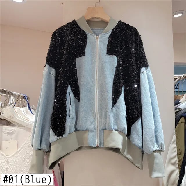 [EWQ] ヨーロッパスタイル長袖フィッティングコントラストスパンコールデニムジャケットルーズオーバーコート 2024 春冬 7010 ロング スプリング 春物 ウィンター 冬物 ヨーロピアン