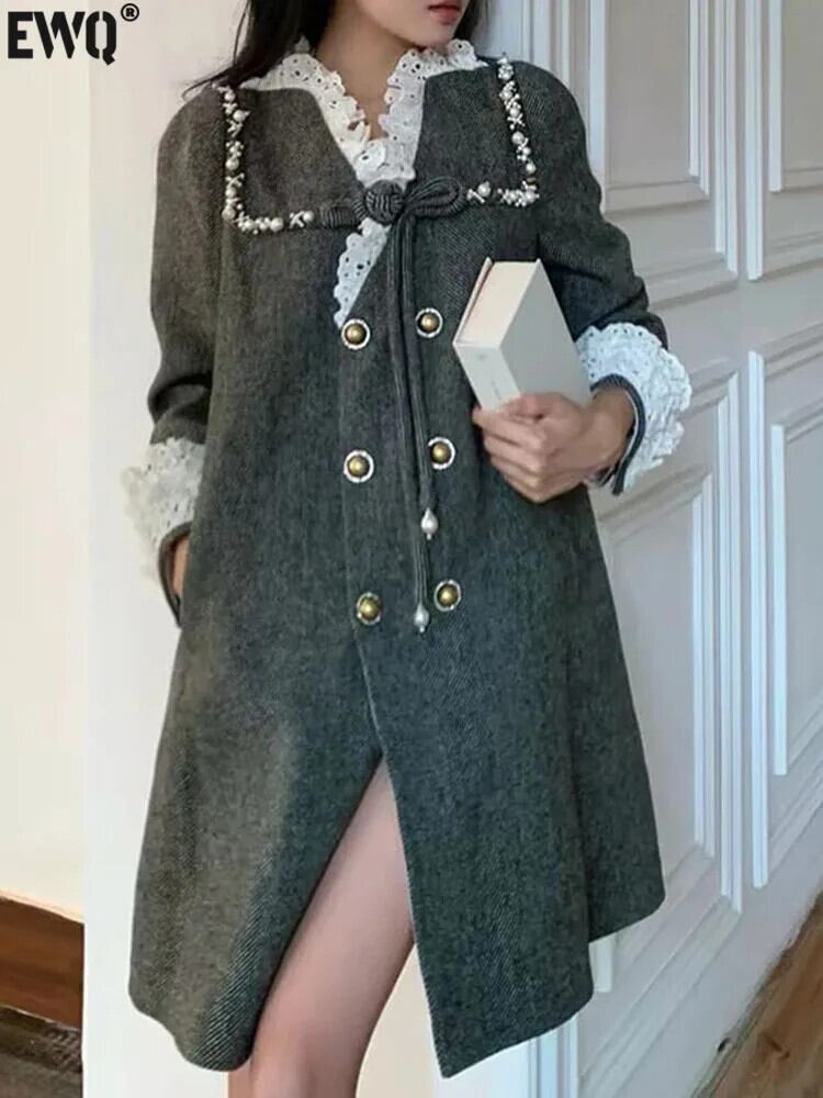[EWQ] ウールオーバーコートレースレースルック V ネックビーズパッチワーク巾着シックボタンウールブレンドコート秋 オータム 秋物 Vネック