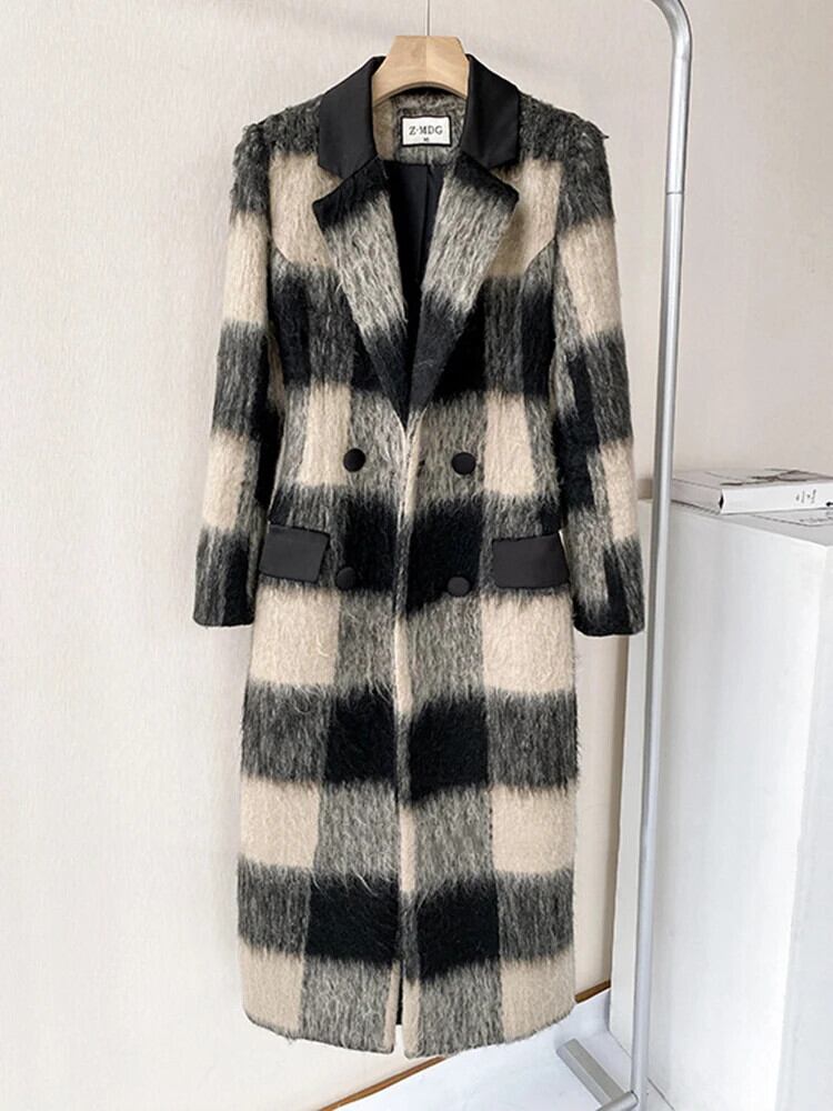 【EWQ】コントラストカラーノッチチェック柄ロングアウター秋ウールコート 23A2925 オータム 秋物