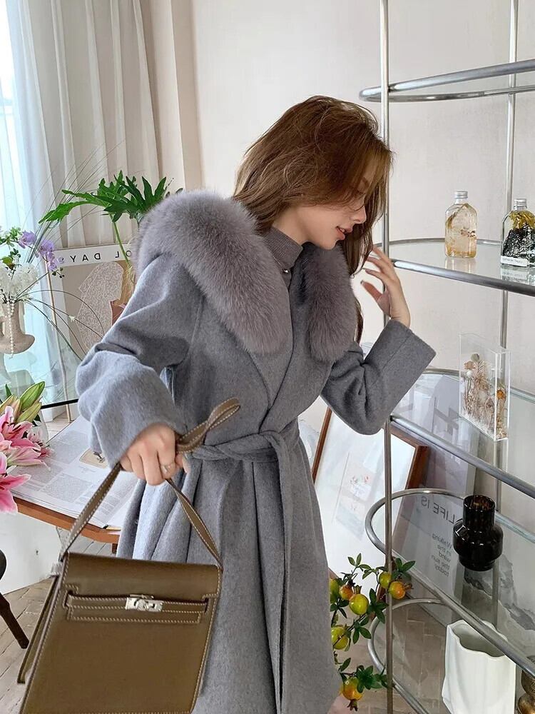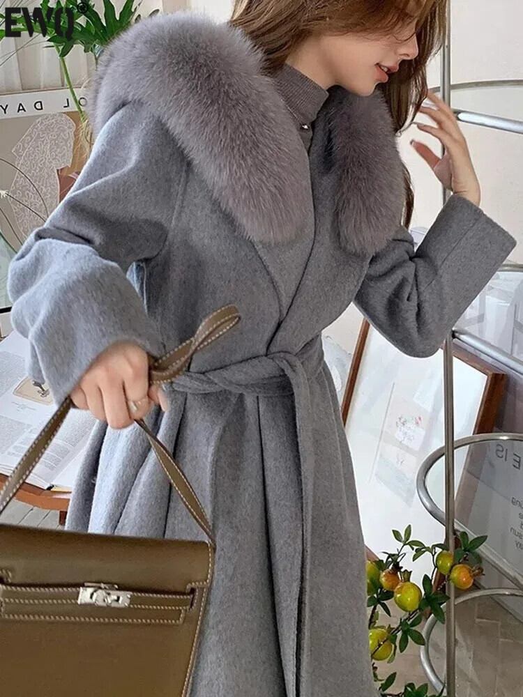 [EWQ] 気質フード付きウールコート婦人フェイクフォックスファー襟カシミヤジャケット秋冬16U6912 オータム 秋物 ウィンター 冬物