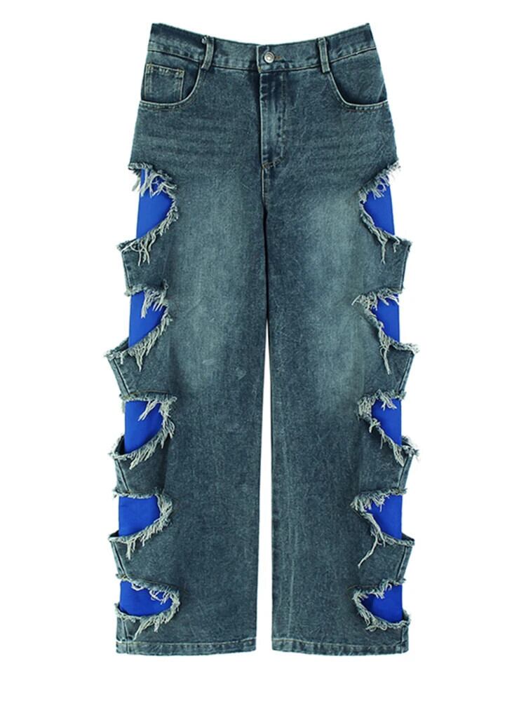 [EWQ] ストリート Y2K ダメージジーンズ コントラスト二層ルーズストレートレッグパンツ 2024 春秋 16U7027 スプリング 春物 オータム 秋物
