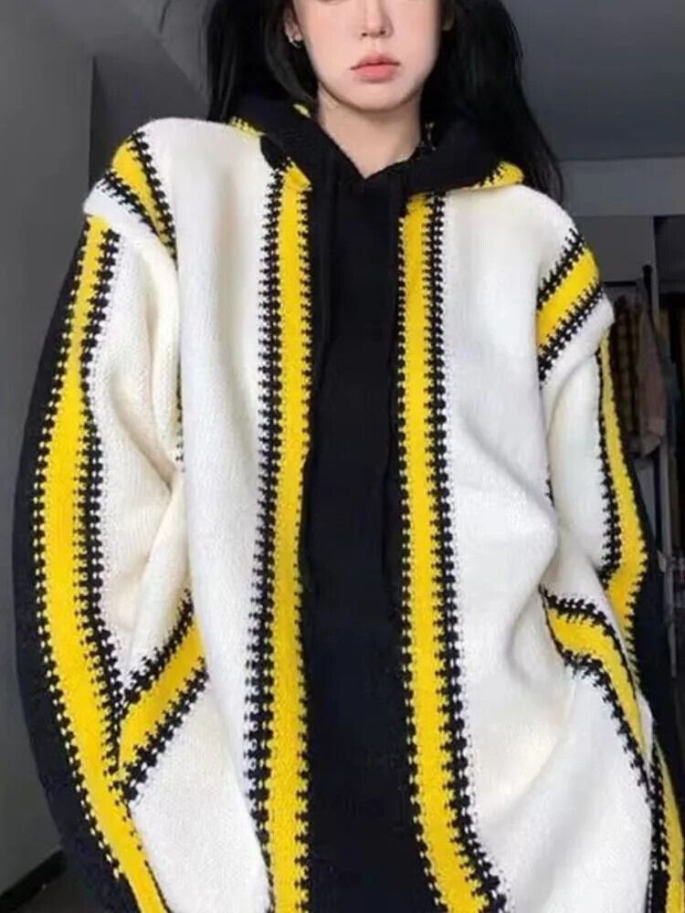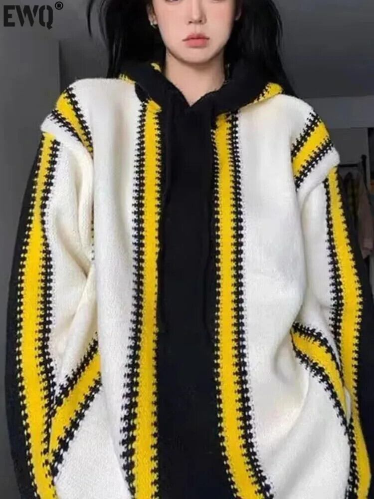 [EWQ] オーバーサイズ コントラスト カラー パッチワーク ストライプ フード付き ニット セーター レディース 秋冬 16U6481 オータム 秋物 ウィンター 冬物