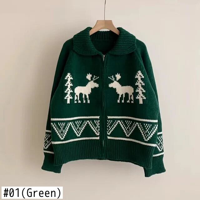 [EWQ] メリークリスマスコントラストカラーラペルジッパーカーディガンセーター婦人漫画ニット秋冬 16U6810 オータム 秋物 ウィンター 冬物