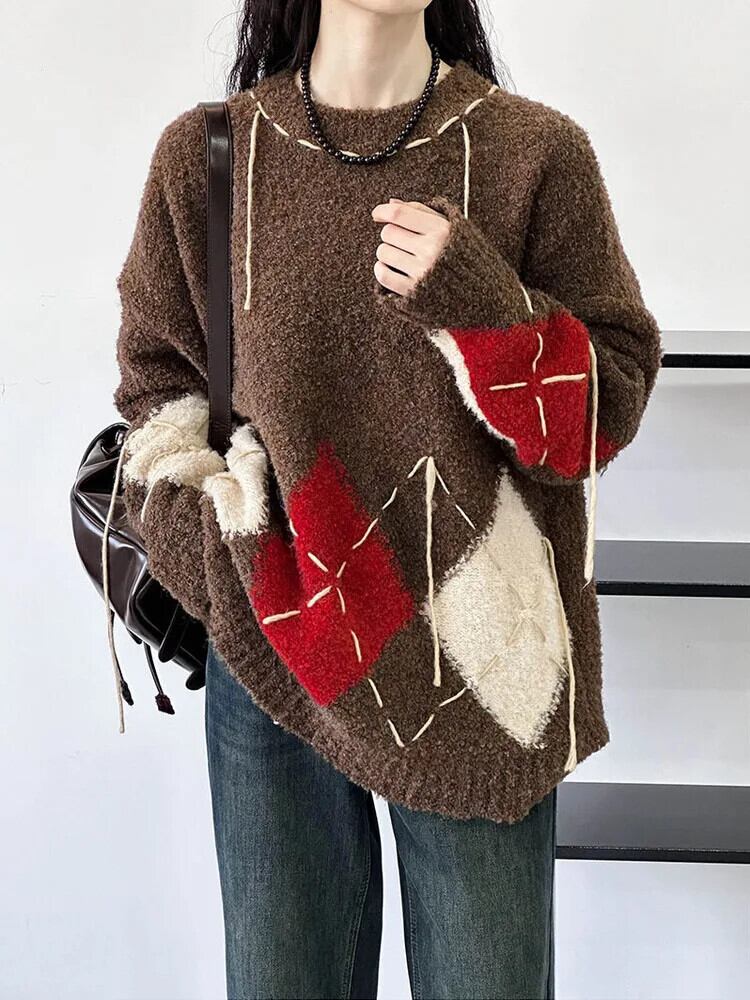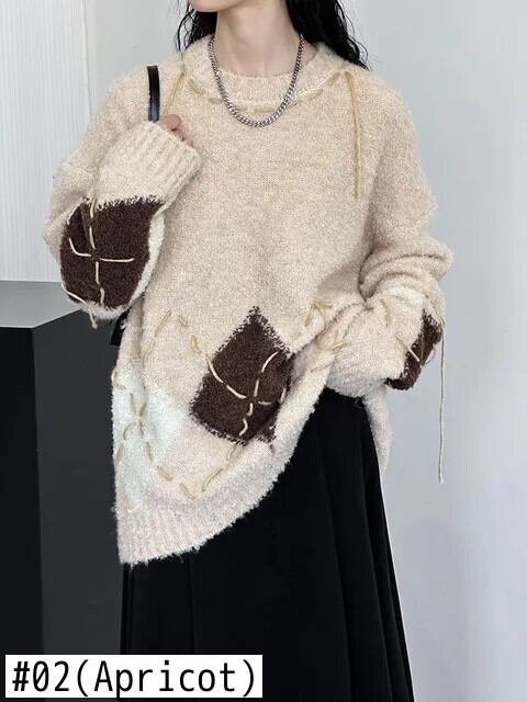 [EWQ] ルーズコントラストカラーニットセータープルオーバートップス婦人Oネックジャンパー2024春夏16U7076 スプリング 春物 ウィンター 冬物