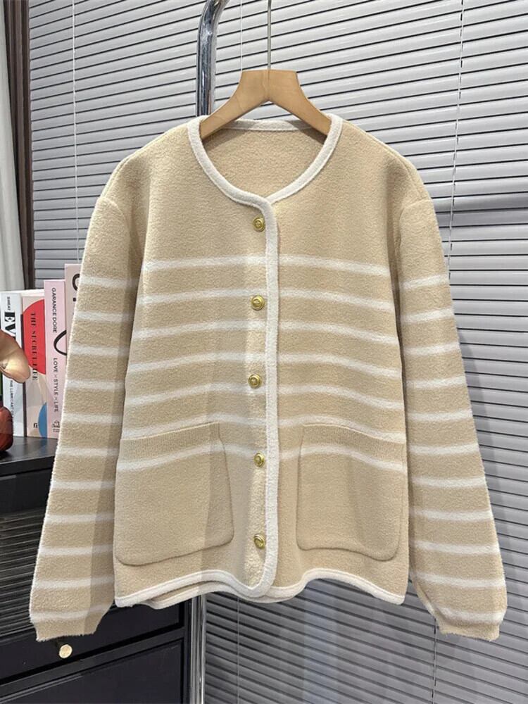 [EWQ] O ネックシングルブレストストライプニットカーディガンセータージャケット暖かいニット 2024 春冬 16U7048 スプリング 春物 ウィンター 冬物 Oネック