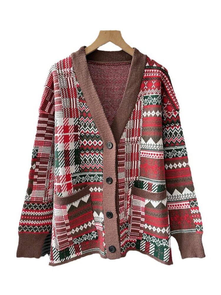 [EWQ] レッドカラフルクリスマスカーディガンコート長袖シングルブレストルーズセータージャケット秋冬 16U5371 ロング オータム 秋物 ウィンター 冬物