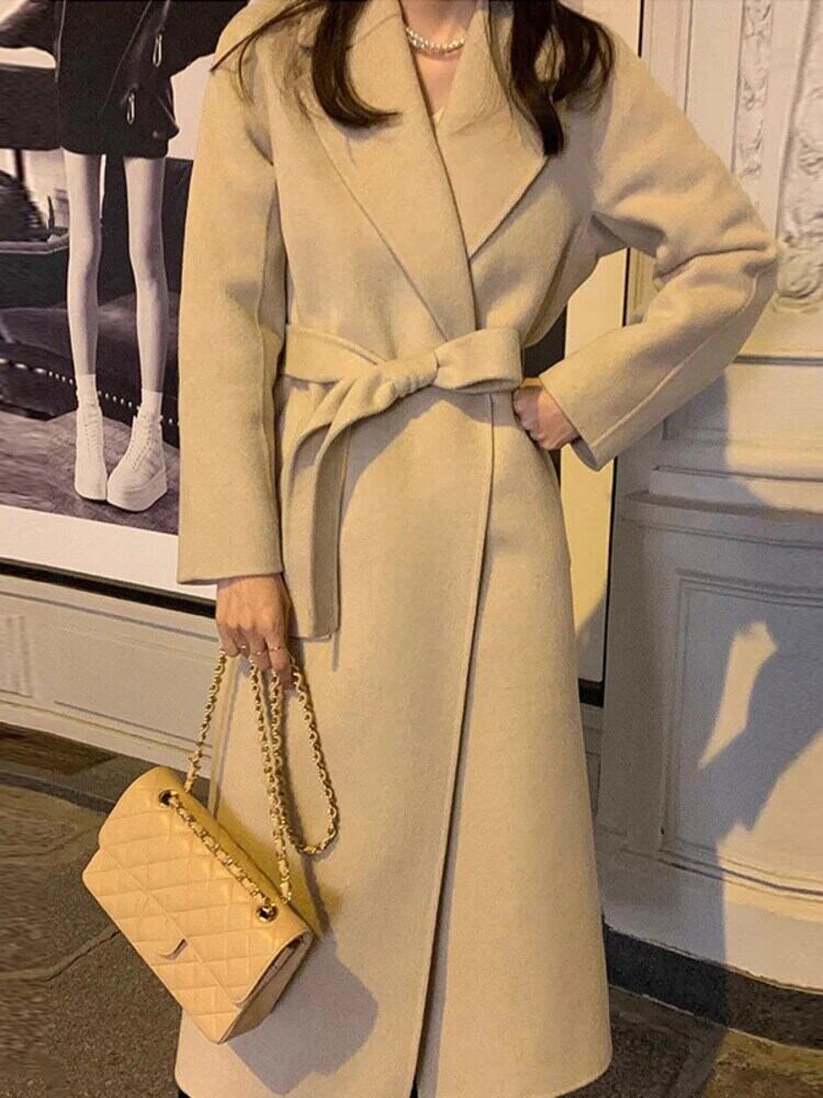 [EWQ] 気質スーツ 襟レースアップ ウエストスリム ミドル丈 無地 ウールコート レディース 厚手 防寒着 アウター 16U6543 ソリッドカラー