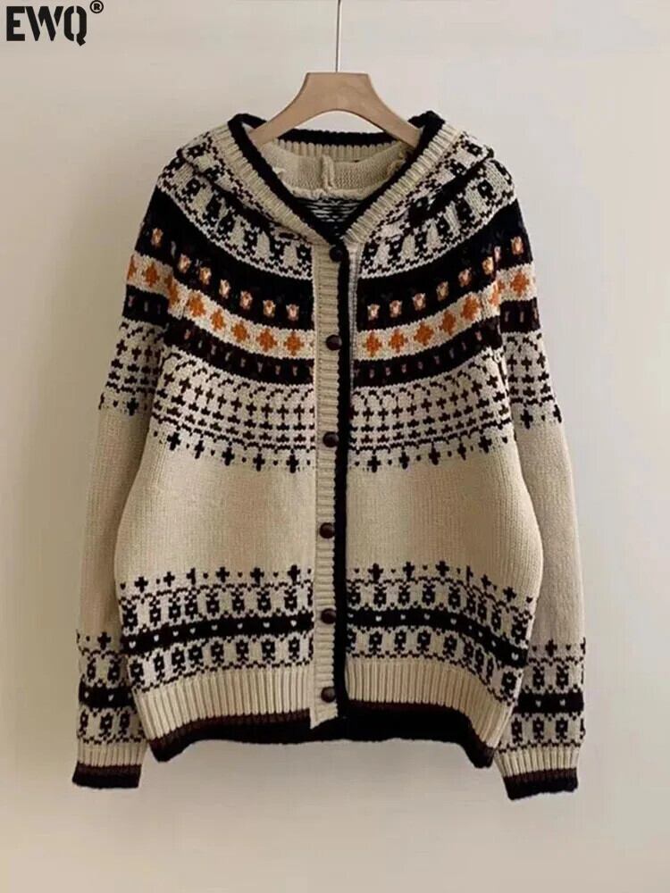 [EWQ] ジャカード フード付き シングルブレスト セーター ジャケット レディース ルーズ オールマッチ ニット カーディガン ニット 2024 春夏 23A6612 スプリング 春物 ウィンター 冬物