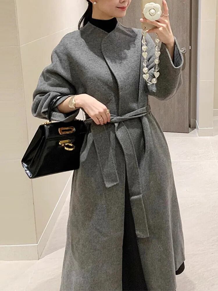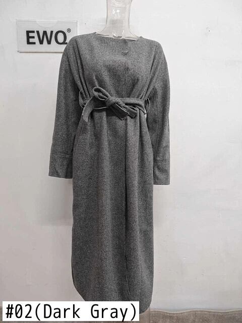 [EWQ] シックカーディガンベルトウールコート長袖ルーズ生き抜く秋 Chemisier U4447 ロング オータム 秋物 ハーネス