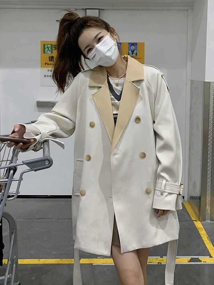 [EWQ] ベージュパッチワークベルトショートトレンドコートダブルブレストルーズウインドブレーカージャケット秋冬アウター オータム 秋物 ウィンター 冬物 ハーネス