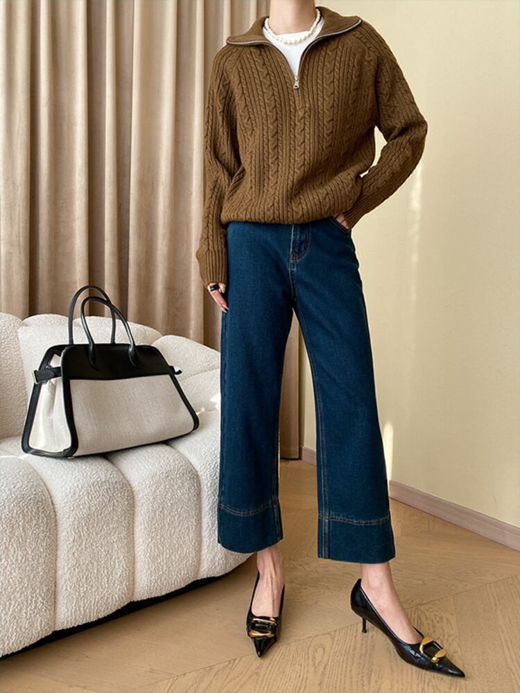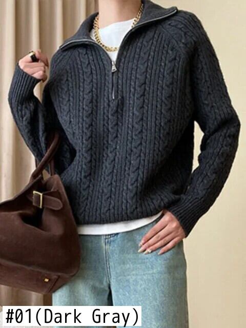 [EWQ] ハーフジッパー ラペル襟 ルーズ ツイスト ニット プルオーバー セーター レディース ベーシック 暖かい ニット 2024 春夏 3A6725 スプリング 春物 ウィンター 冬物