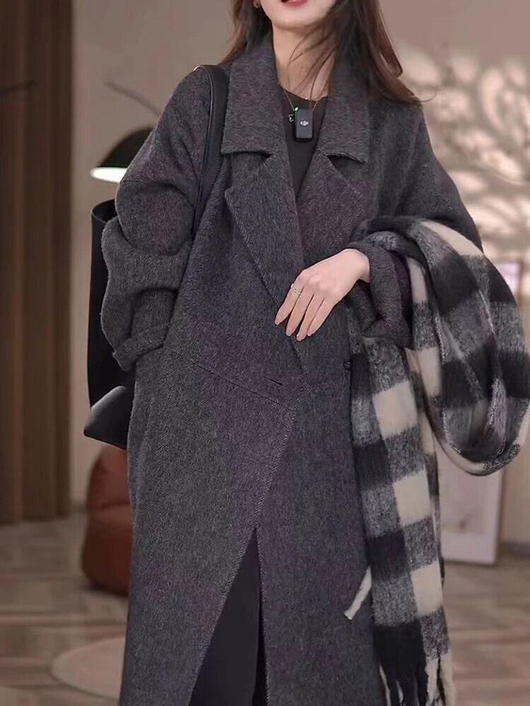 [EWQ] グレーカシミヤコートホーンボタンポケット長袖ルーズウール厚手オーバーコート秋冬 16U5363 ロング オータム 秋物 ウィンター 冬物