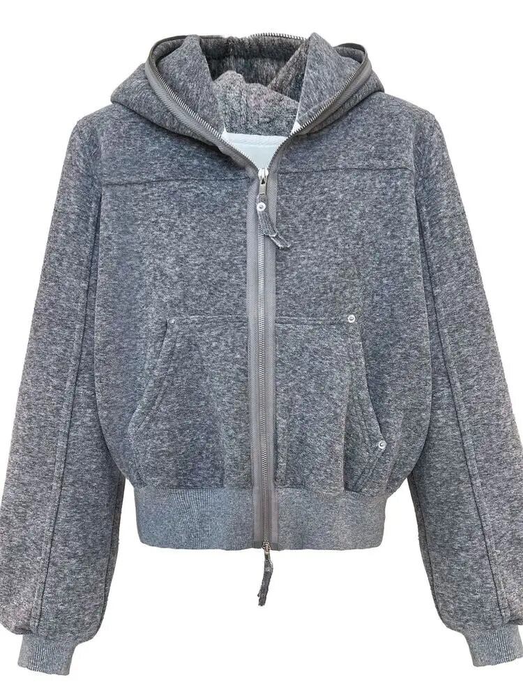 [EWQ] 肥厚ダブルジッパーショートニットフード付きトレーナールーズソリッドカラージャケットトップ 2024 春秋 16U7277 スプリング 春物 オータム 秋物