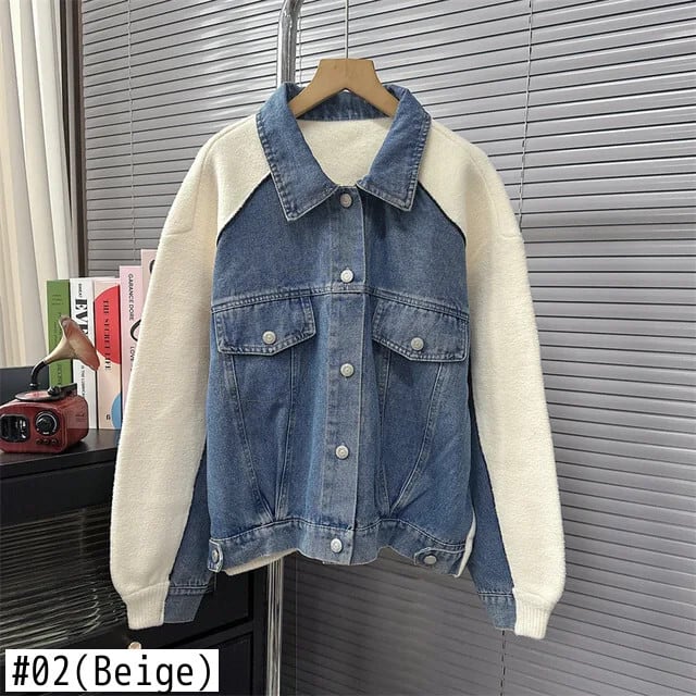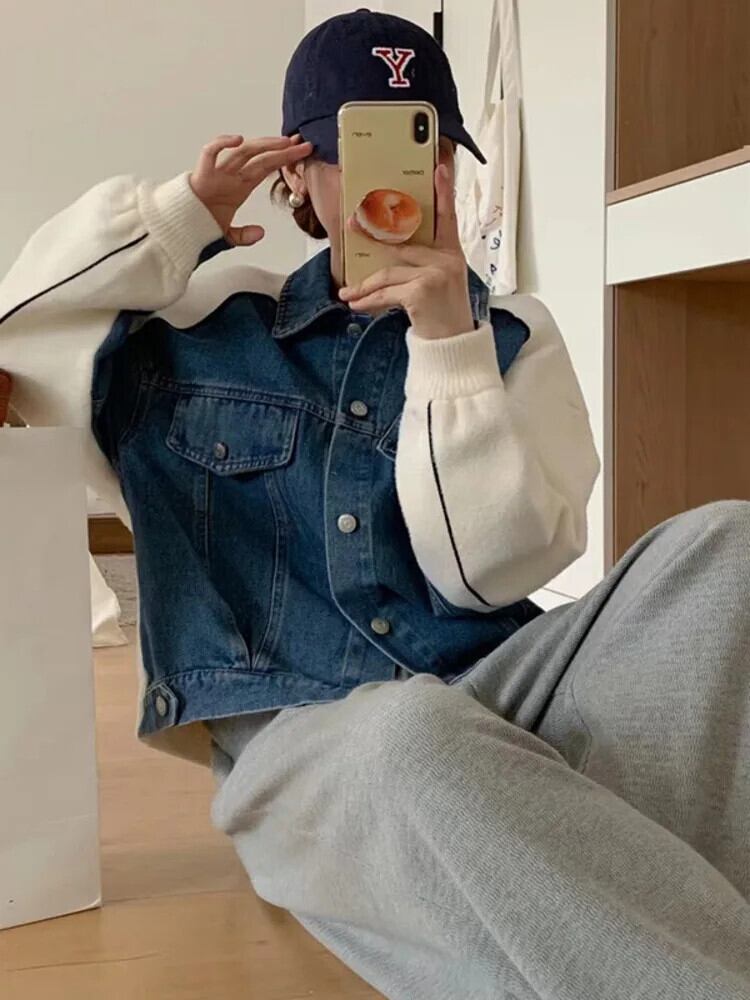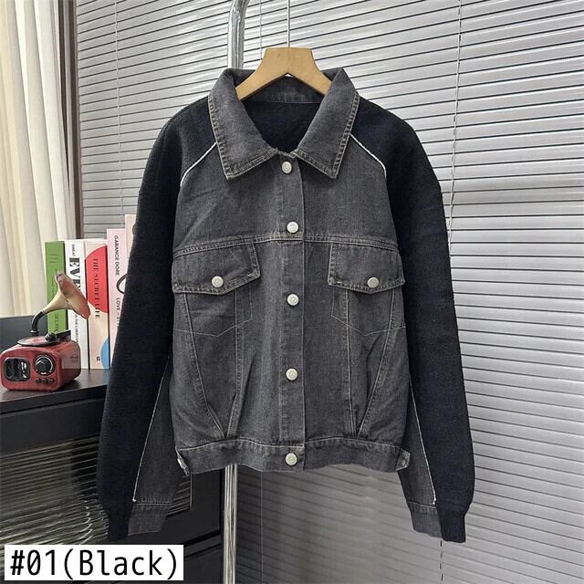 [EWQ] スタイルニットパッチワークショートデニムジャケットストリートフェイクツーピースジャケット 2024 春秋 6U7400 スプリング 春物 オータム 秋物