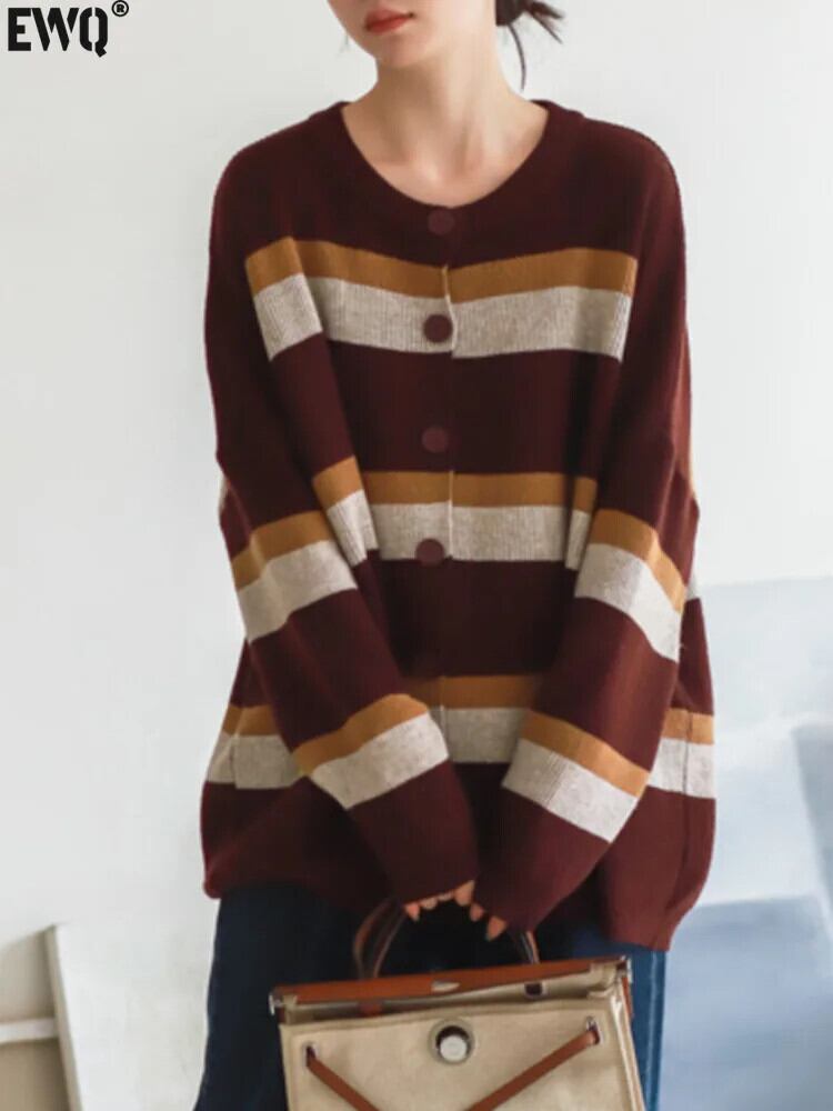 [EWQ] スタイル O ネックシングルブレストストライプ長袖セーターオールマッチニットトップ 2024 春夏 16U7310 ロング スプリング 春物 ウィンター 冬物 Oネック
