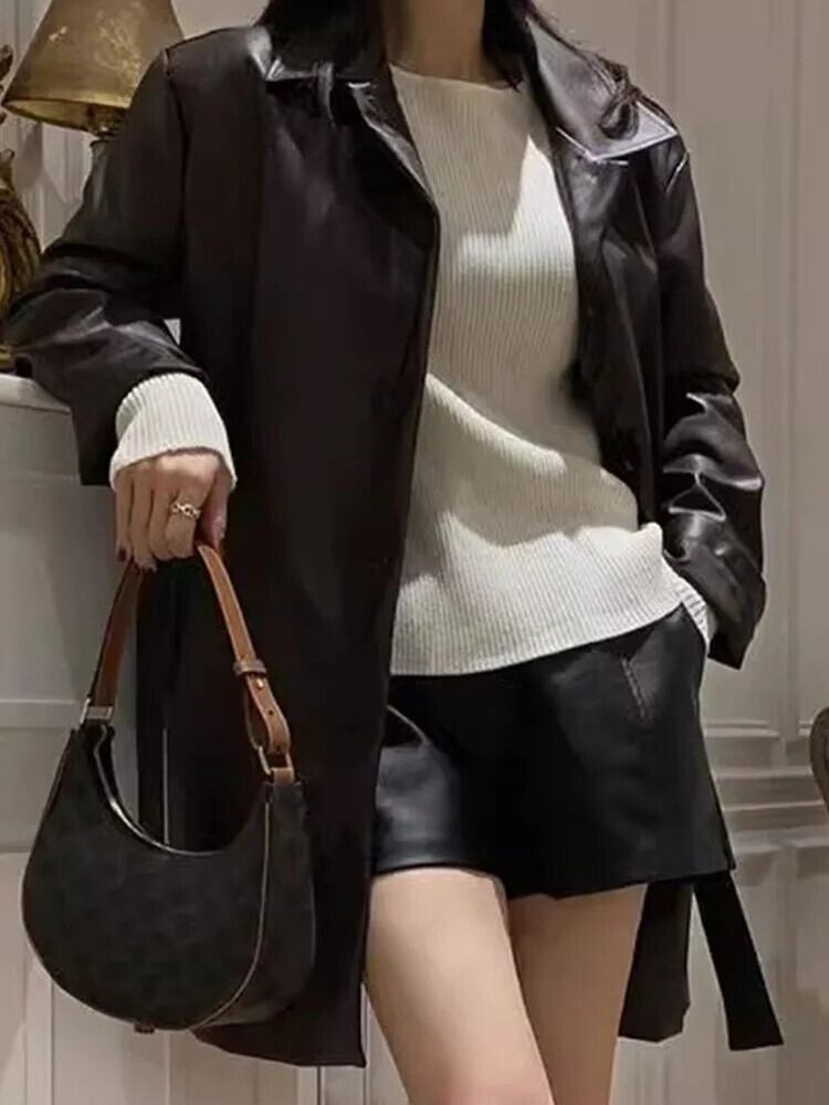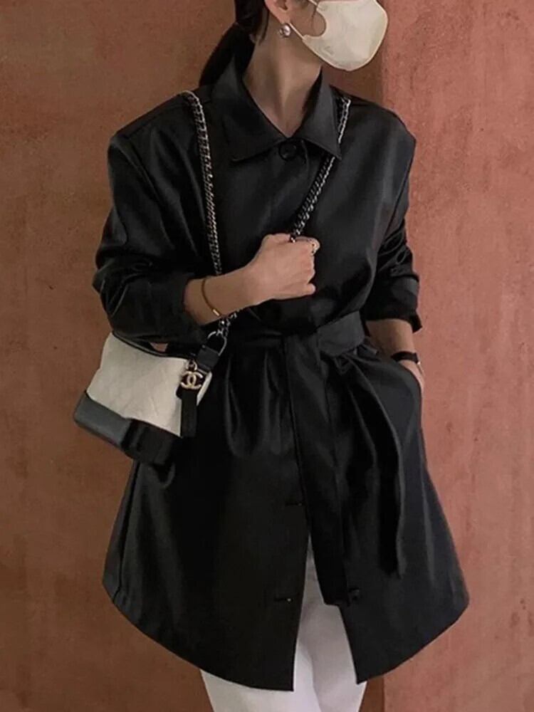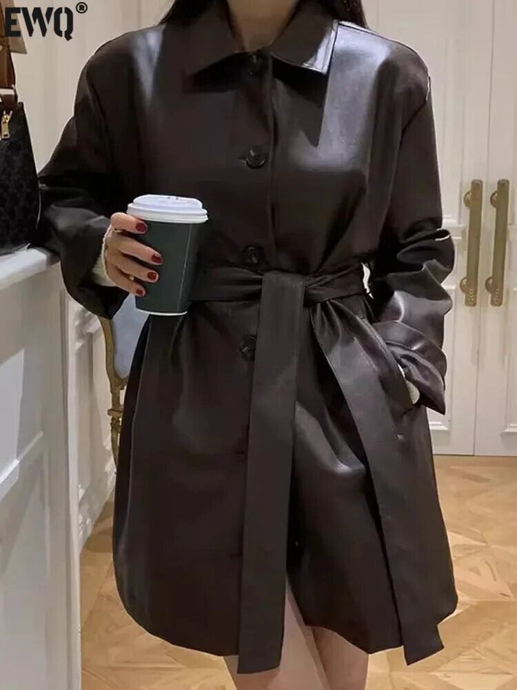 [EWQ] シングルブレストストラップウエストスリム長袖 PU レザージャケットコートウインドブレーカーボンバー秋冬 16U5918 ロング オータム 秋物 ウィンター 冬物