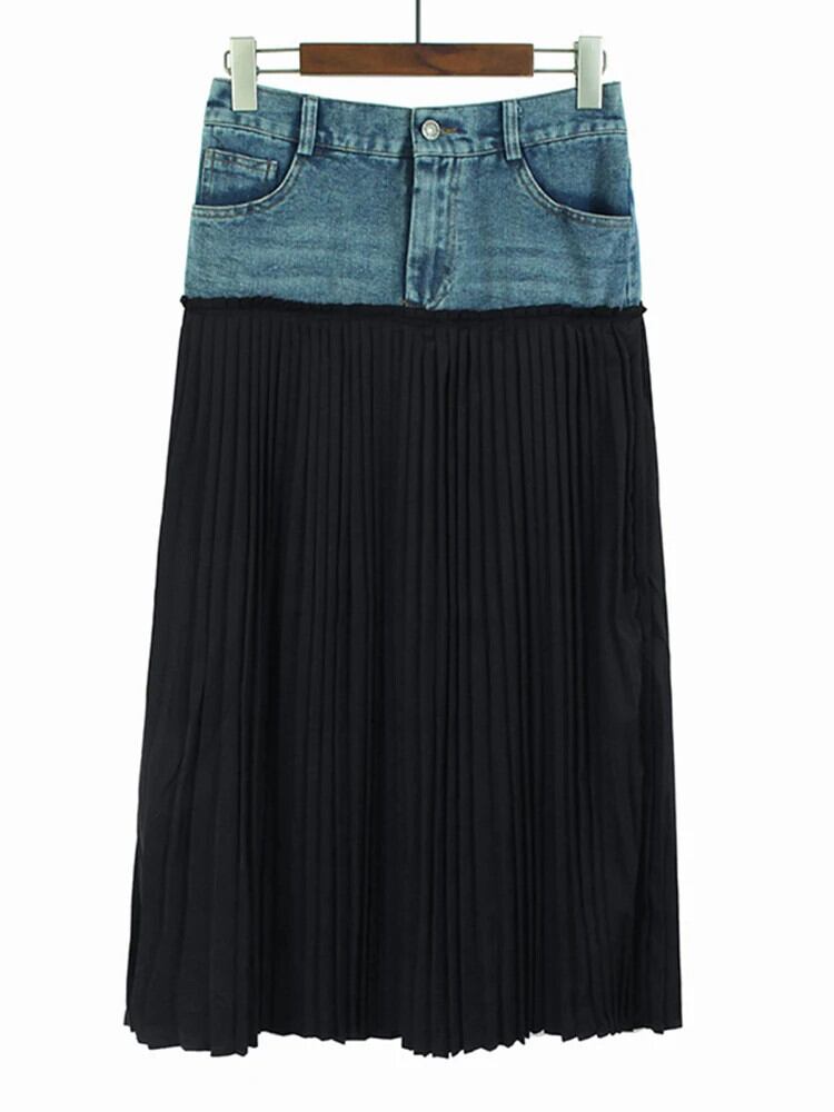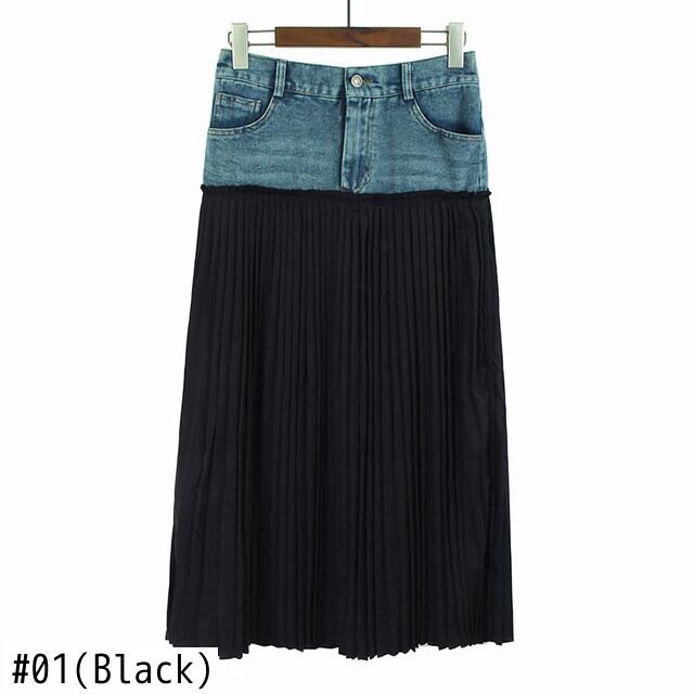 [EWQ] プリーツ パッチワーク A ライン スカート レディース デニム スプライス ウエスト ポケット スカート 秋冬 16U5410 オータム 秋物 ウィンター 冬物 Aライン
