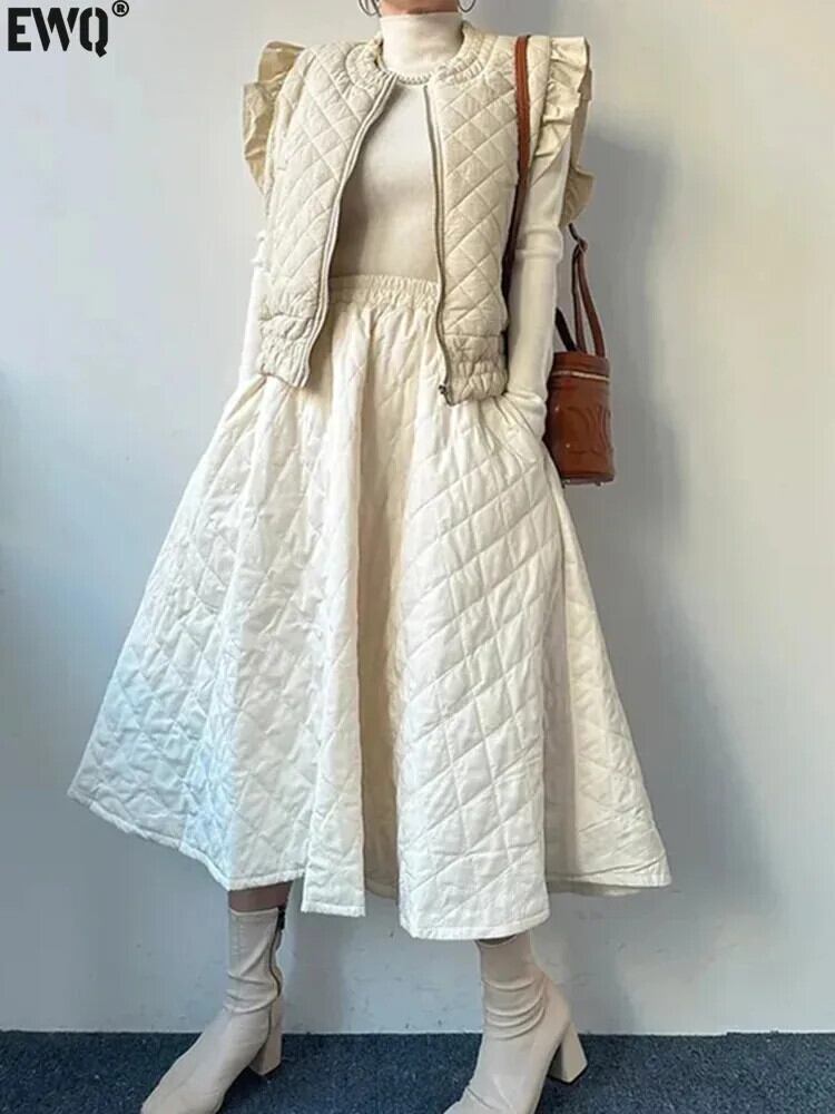[EWQ] O ネックチェック柄ジッパーベストジャケットウエストオールマッチ A ラインスカートレディース 2024 春秋 16U7168 レッド スプリング 春物 オータム 秋物 Oネック Aライン